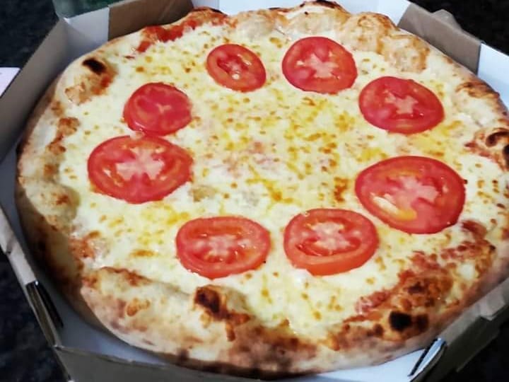 Pizza pequena com quatro fatias, massa, molho de tomates muçarela e rodelas de tomates
